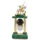 Каждая деталь часов выполнена с исключительным вниманием к деталям. Фигура Святого Георгия Победоносеца, отлитая из бронзы, покоится на постаменте из натурального долерита, шпонированного благородным малахитом (известным своим происхождением из Конго) и латуни, безупречно покрытой золотом (20 мкм высшей пробы) и искусно украшенной ручной гравировкой.